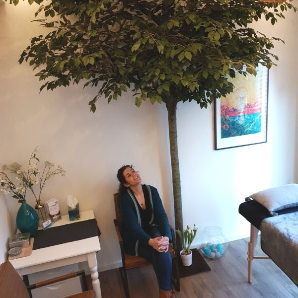 Monique zocht, samen met haar partner, een woning met een bijgebouw voor haar praktijk. In Hoef en Haag vonden ze die woning in het Dorpshart. Het bijgebouw op de tekeningen hebben ze zodanig laten aanpassen zodat het geschikt werd voor de praktijk, met een hal als wachtruimte, een toilet, een pantry en natuurlijk een mooie ruimte om de cliënten te behandelen. De mogelijkheid om de hoogte in te gaan door de vliering niet te gebruiken maakt de kamer extra ruimtelijk. Met een boom als metafoor voor aarden en gronden maakte Monique het helemaal af!